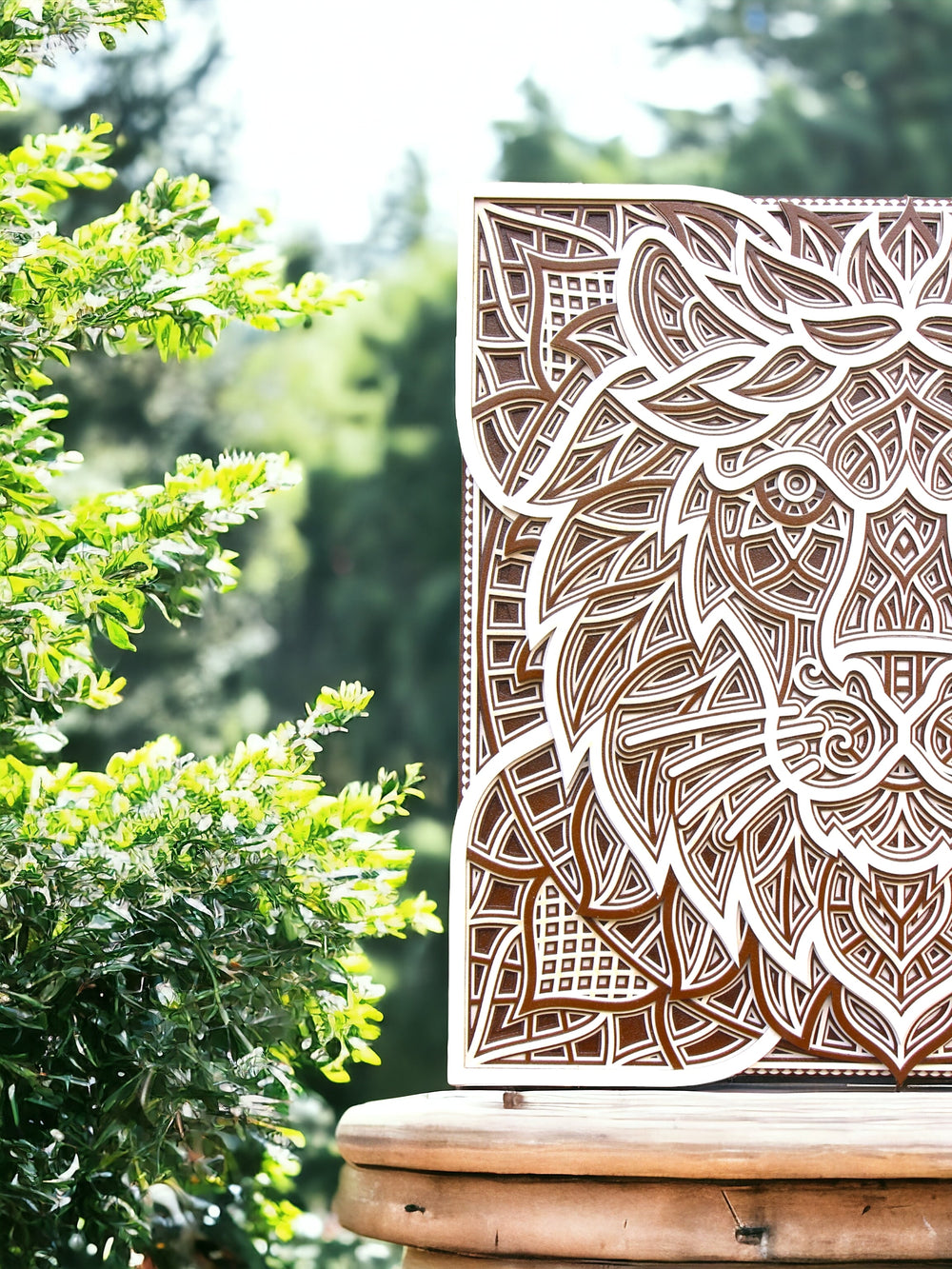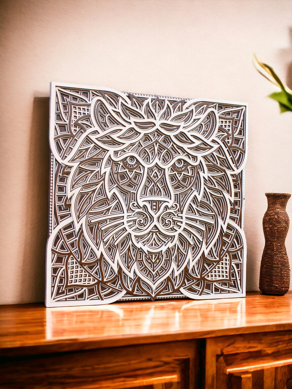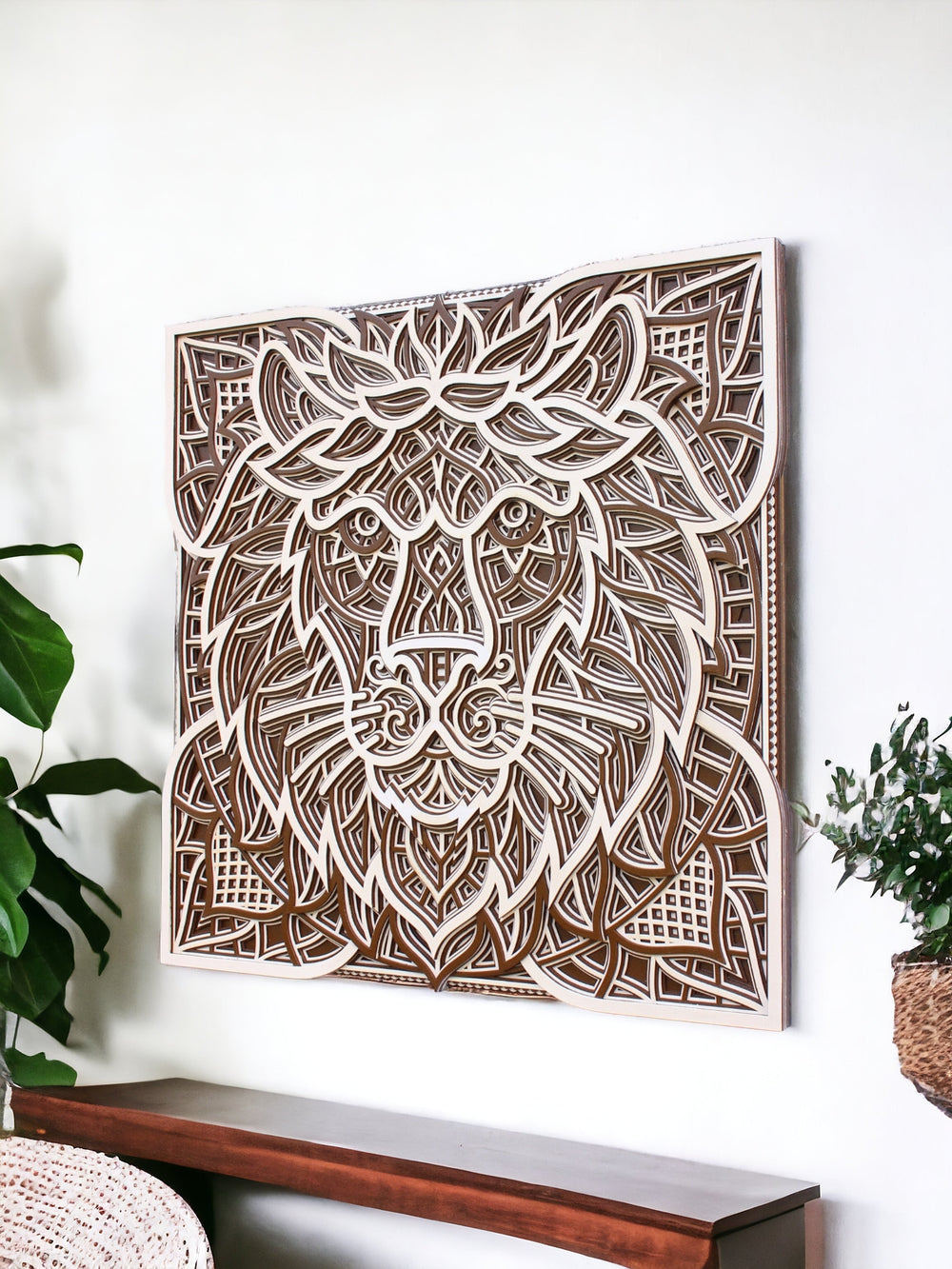 Elevate your home with the "3D Lion Head Square Mandala," a mark of bravery and royalty. Artisans carefully shape this bold lion, the jungle's ruler, with geometric mastery. Strong lines and kingly patterns echo the lion's undaunted spirit. The square mandala blends tradition with contemporary style.
