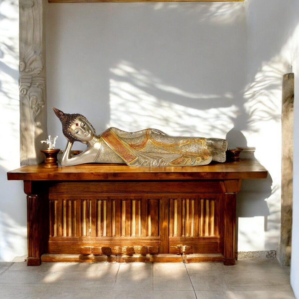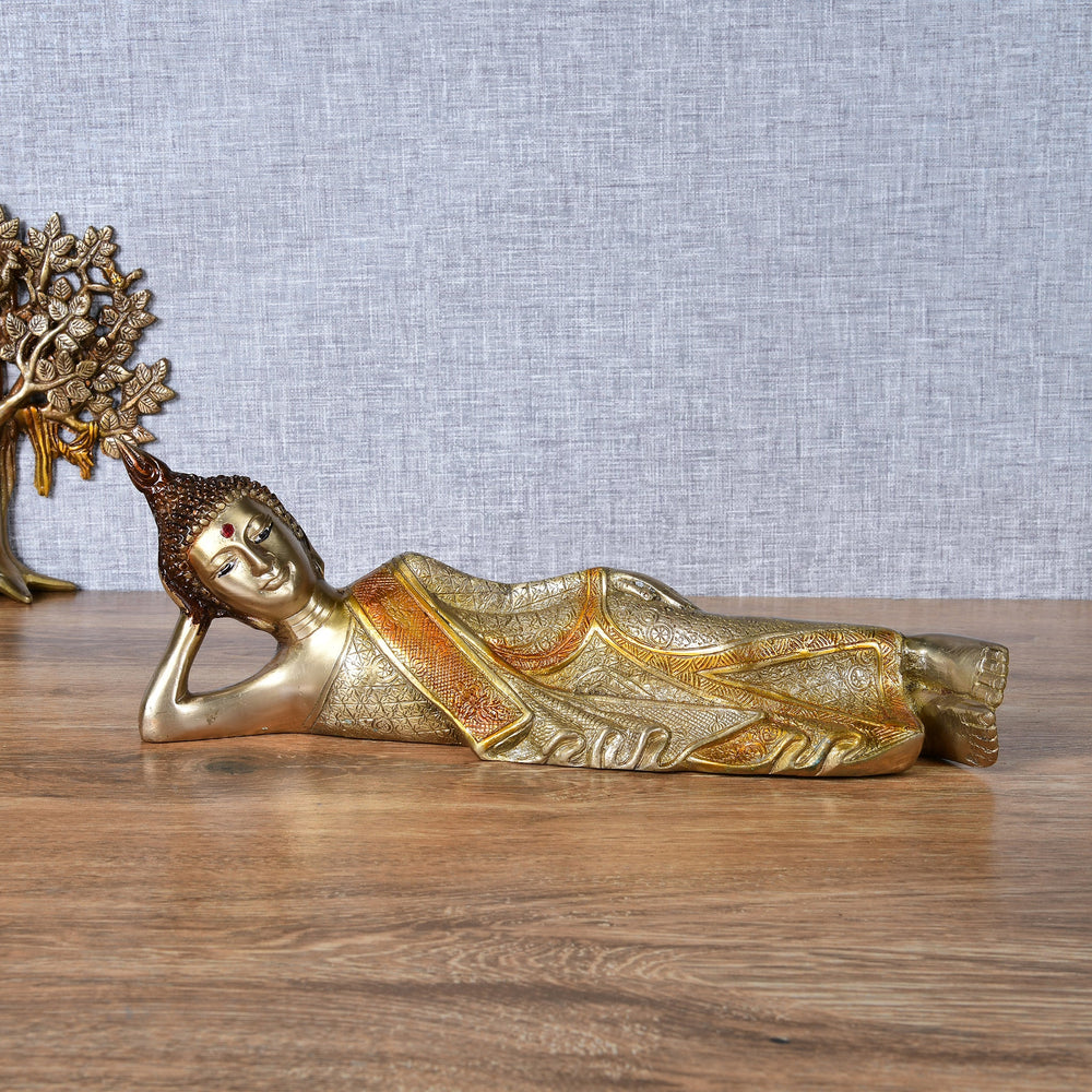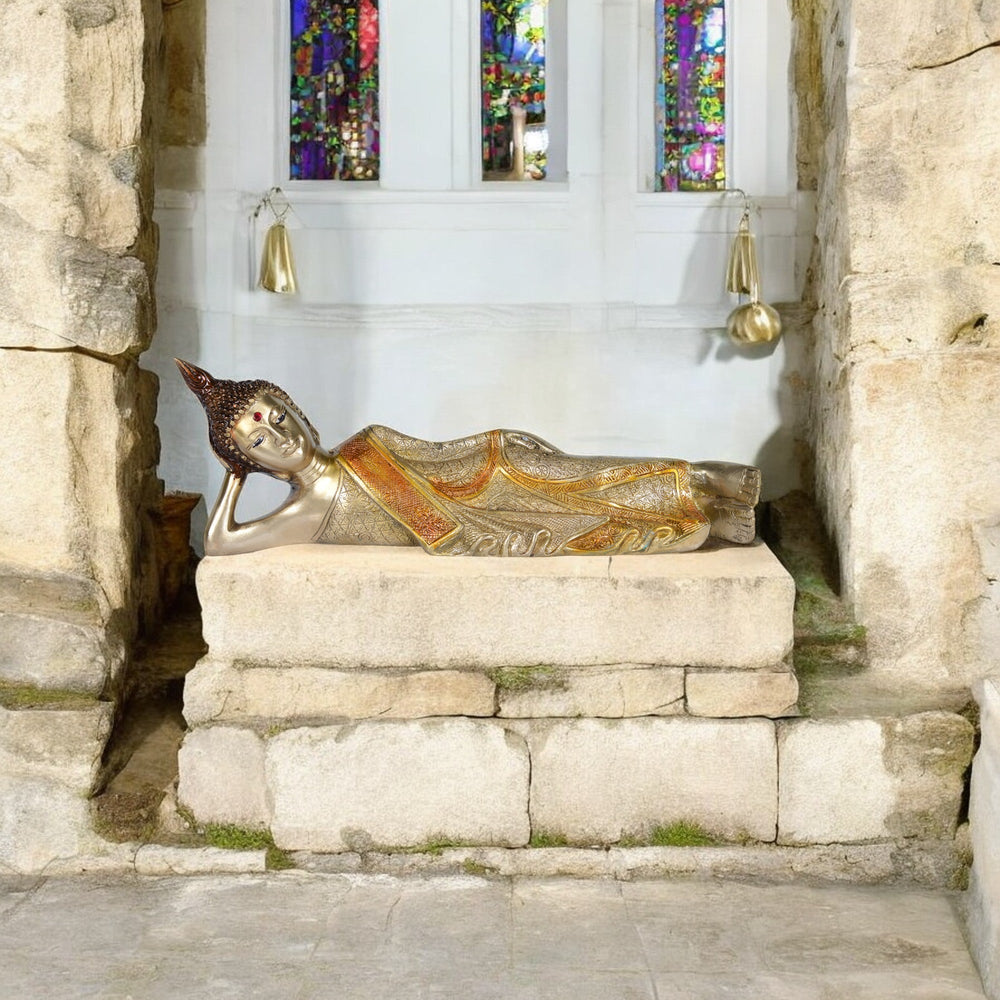 Discover serenity with our Brass Reclining Buddha. This elegantly designed statue features the Buddha in a peaceful reclining pose, symbolizing the Buddha's final moments before entering Nirvana. It represents tranquility, detachment from worldly desires, and the ultimate state of enlightenment. Crafted from high-quality brass, it showcases fine detailing and a rich finish that adds sophistication to any space. Perfect for meditation areas or as a calming decorative piece, it’s a beautiful reminder of inner peace and spiritual growth