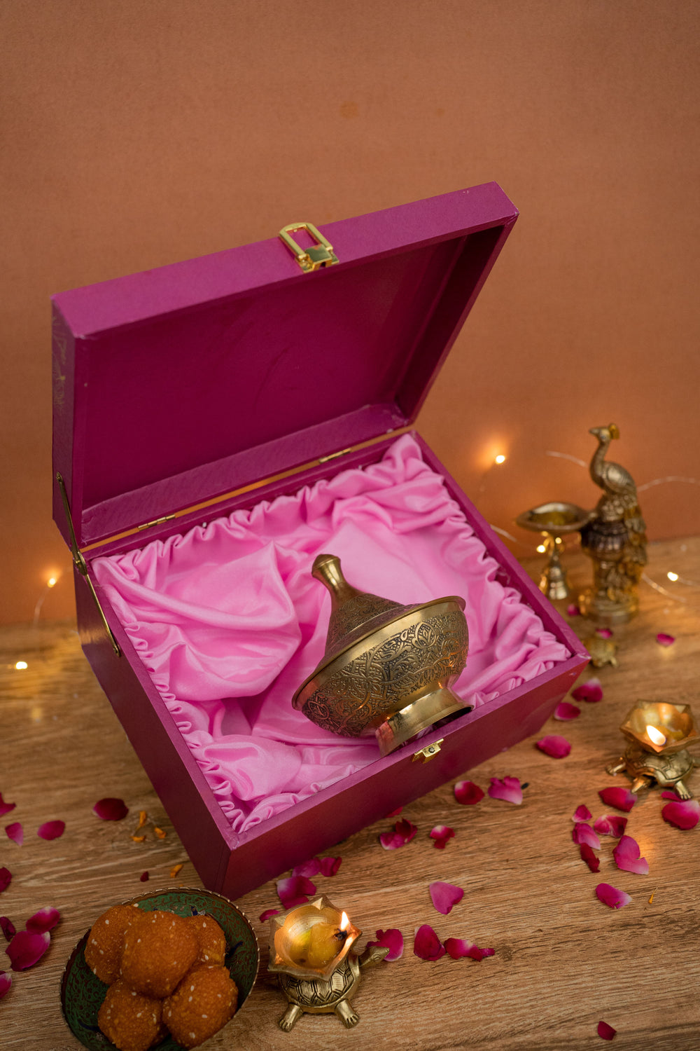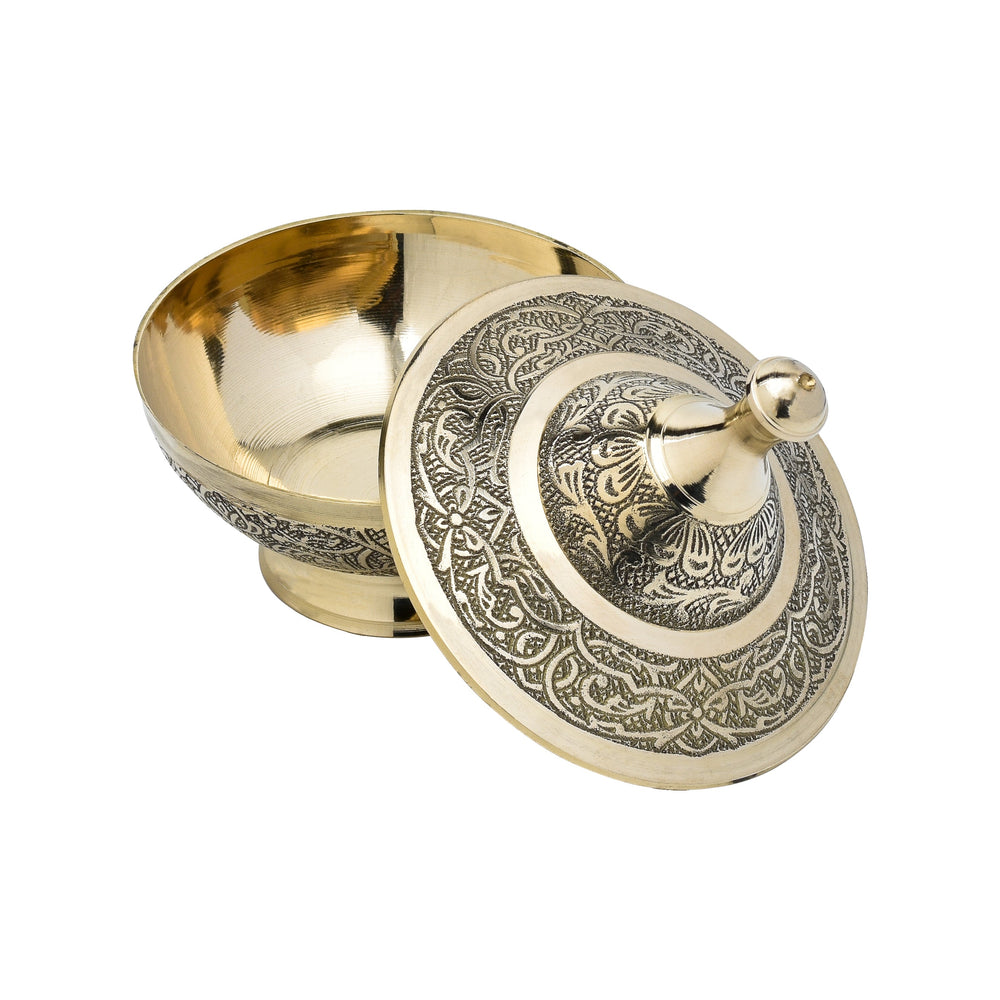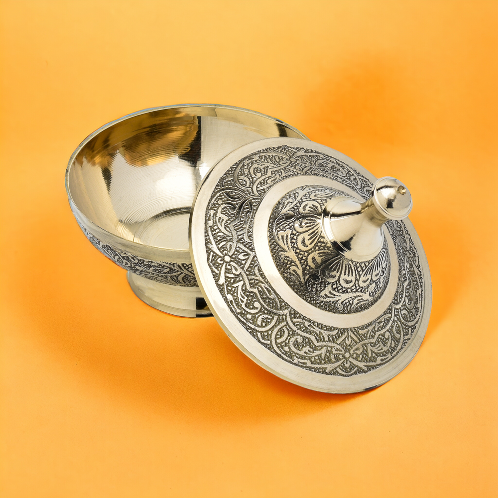 This brass bowl with a lid is perfect for storing dry fruits, candies, potpourri, or small treasures. Its cultural richness and sophistication, thanks to the carvings and brass material, make it suitable for both practical use and decorative purposes, adding an elegant touch to any space