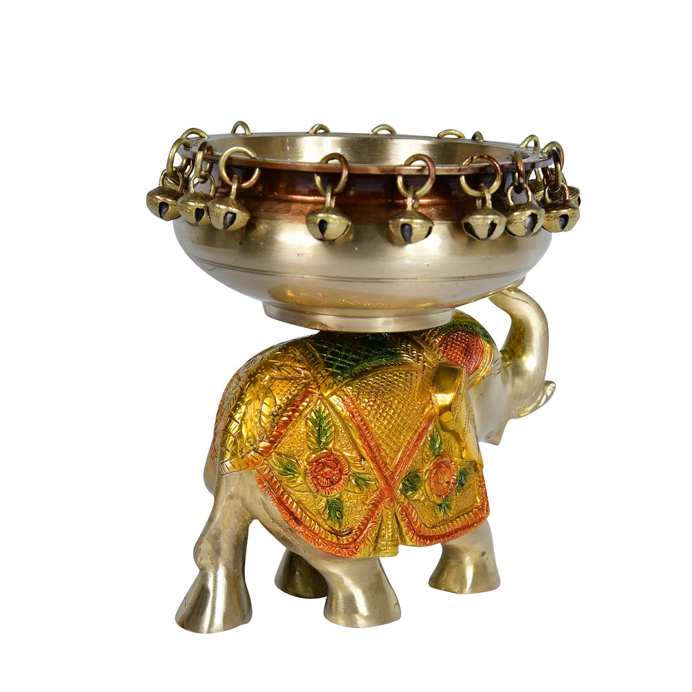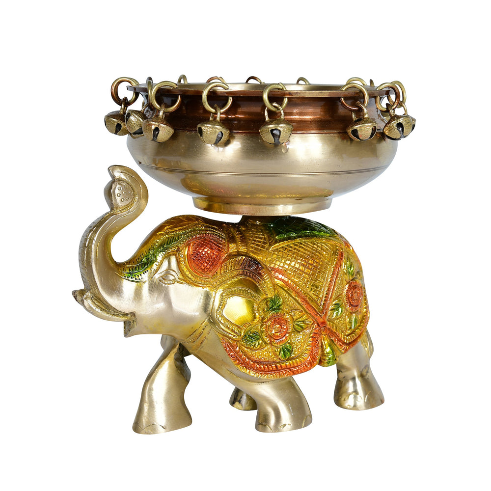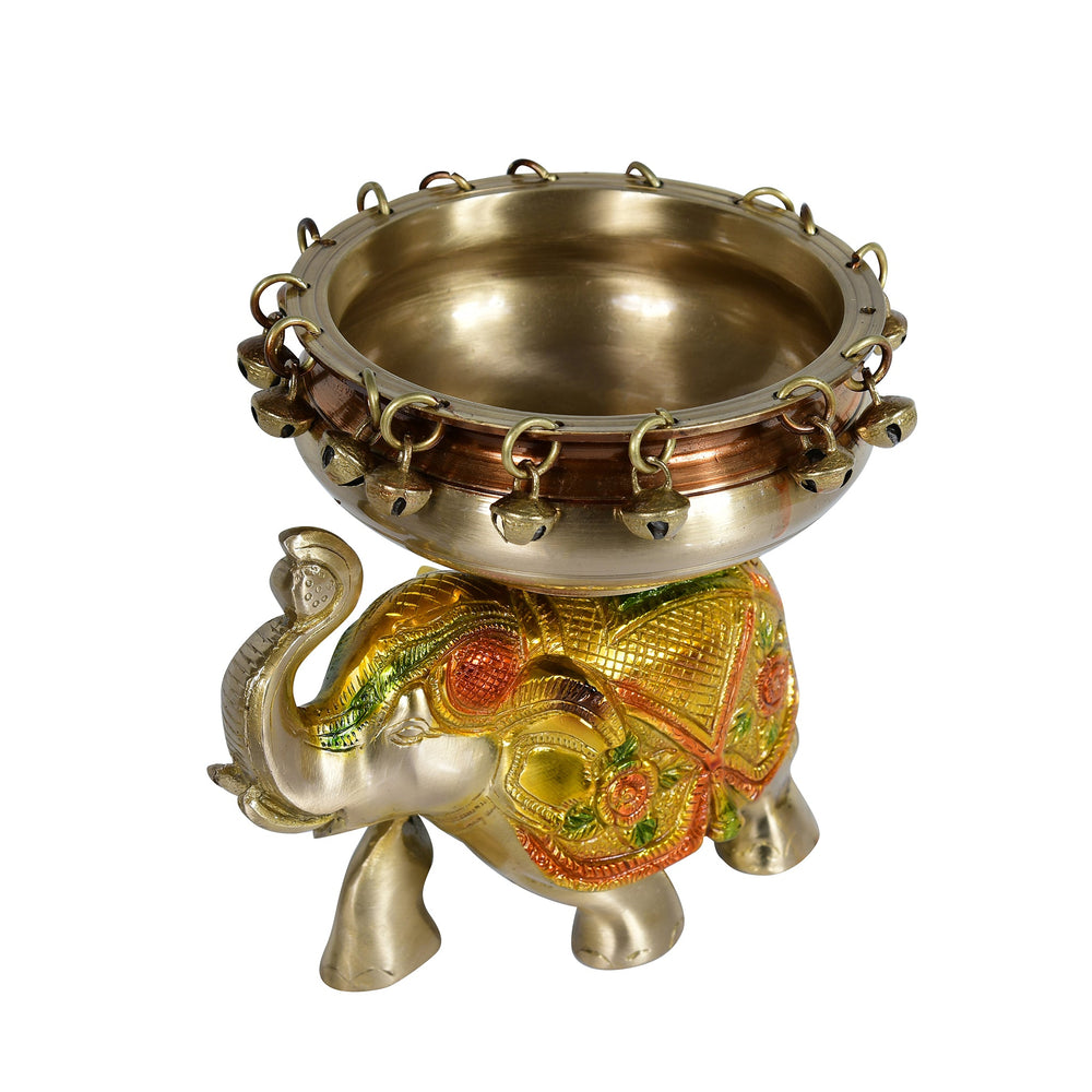 Handcrafted brass urli with detailed elephant design.