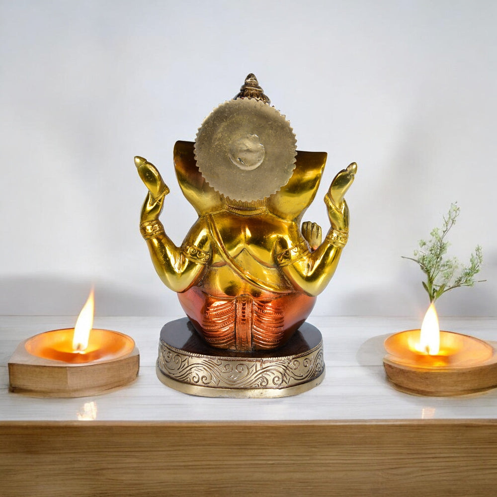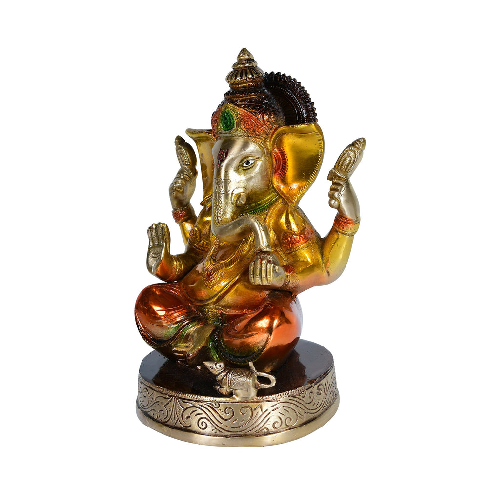 Introducing our Brass Colorful Ganeshji sitting on Gaddi—a vibrant blend of artistic brilliance and spiritual significance. Expertly crafted by skilled artisans, this sculpture portrays Lord Ganesha in vivid hues, seated gracefully on a traditional pedestal, radiating charm and positivity. Made from premium brass and adorned with colorful accents, it adds a touch of elegance to any space. Whether displayed in your home, office, or sacred space, invite the blessings of Lord Ganeshji into your life with this beautifully detailed piece. Embrace its timeless beauty and auspicious aura, perfect for both decor enthusiasts and spiritual seekers alike.