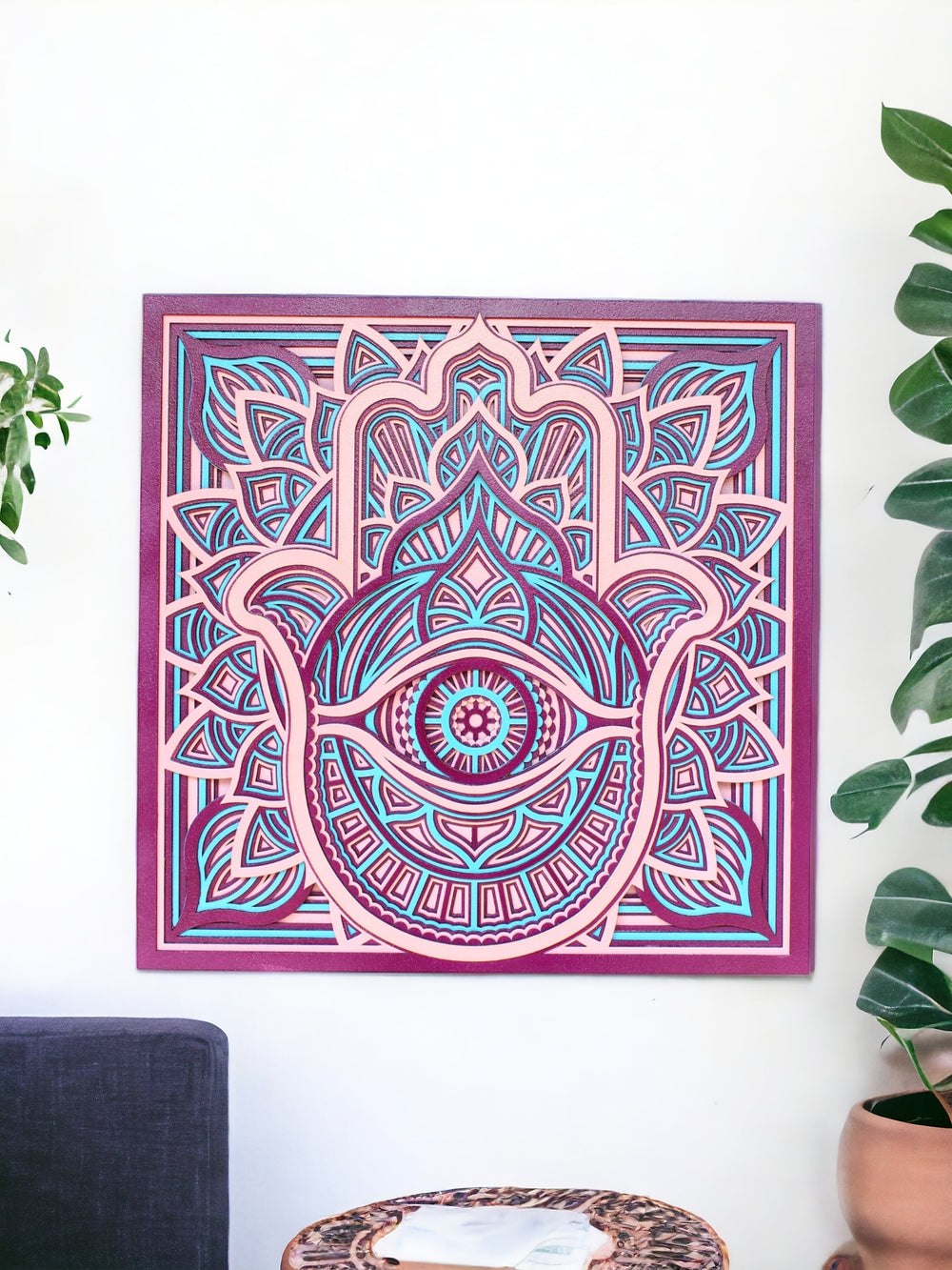Fill your home with the "Evil Eye Hamsa Hand Square Mandala," a guardian of peace. Its vibrant red and yellow hues, crafted with traditional Indian artistry, symbolize strength and protection. Each mandala, hand-carved with care, holds the Hamsa hand, warding off negativity.