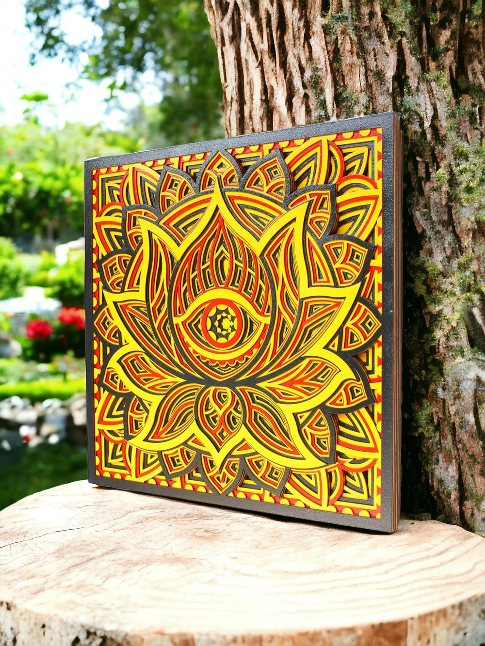 Step into a world of color and culture with the "Evil Eye Lotus Square." A striking piece that marries ancient symbolism with contemporary design. The lotus, a sacred emblem of purity and enlightenment, blooms at the heart of this artwork, surrounded by the protective gaze of the Evil Eye. Each stroke is hand-painted with joyous vigor, embodying prosperity and warding off negativity.