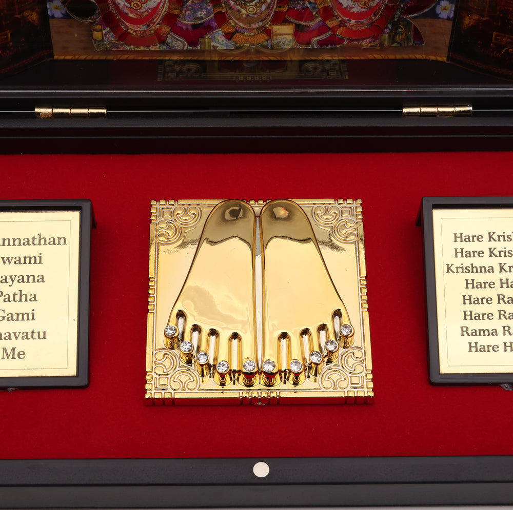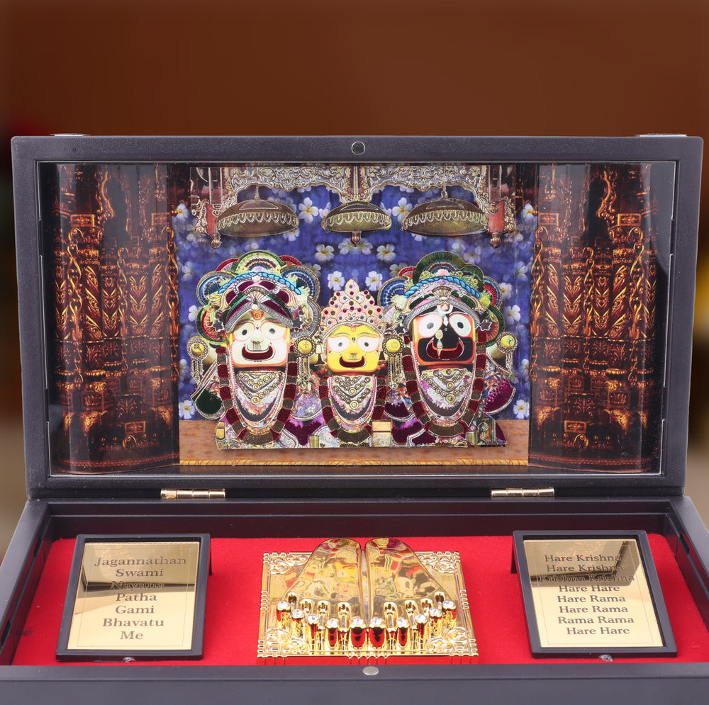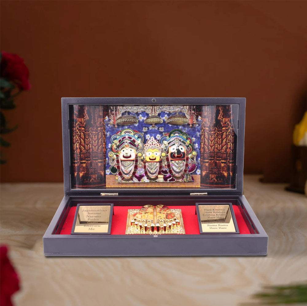 Bring home the divine presence of Lord Jagannath, Balabhadra, and Subhadra with this beautifully crafted Pocket Temple. Designed for devotees who want to carry the blessings of the Puri Jagannath Temple wherever they go, this compact shrine is both spiritual and practical.