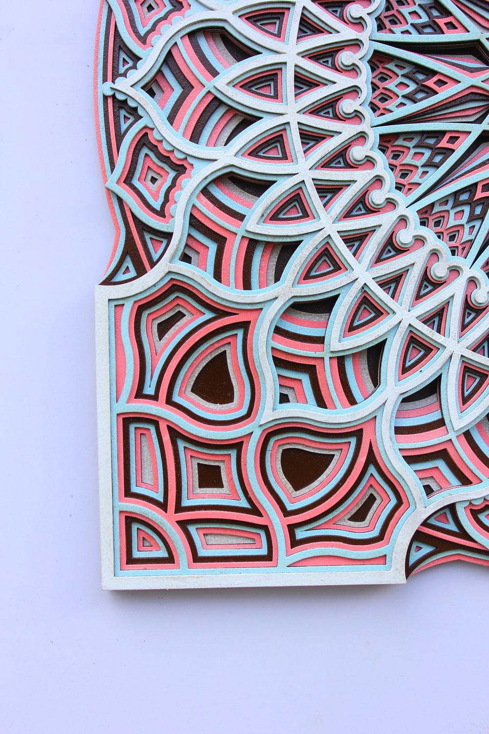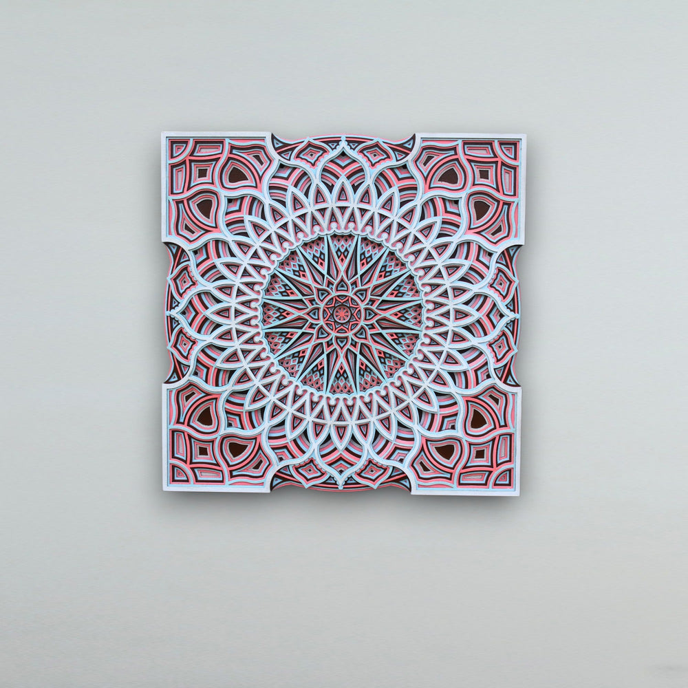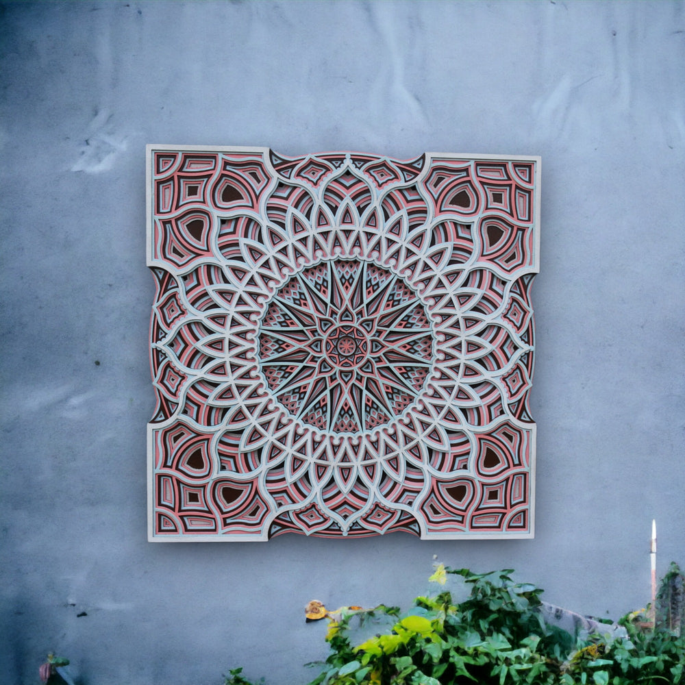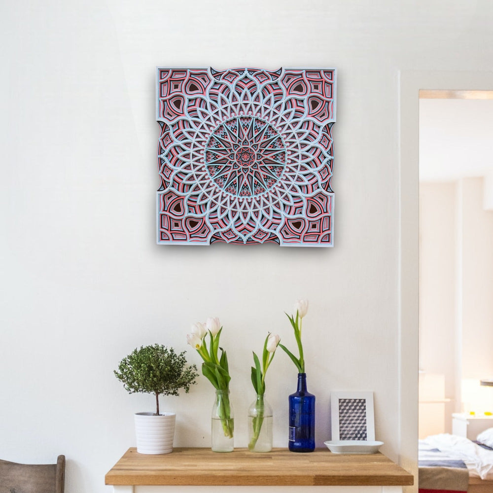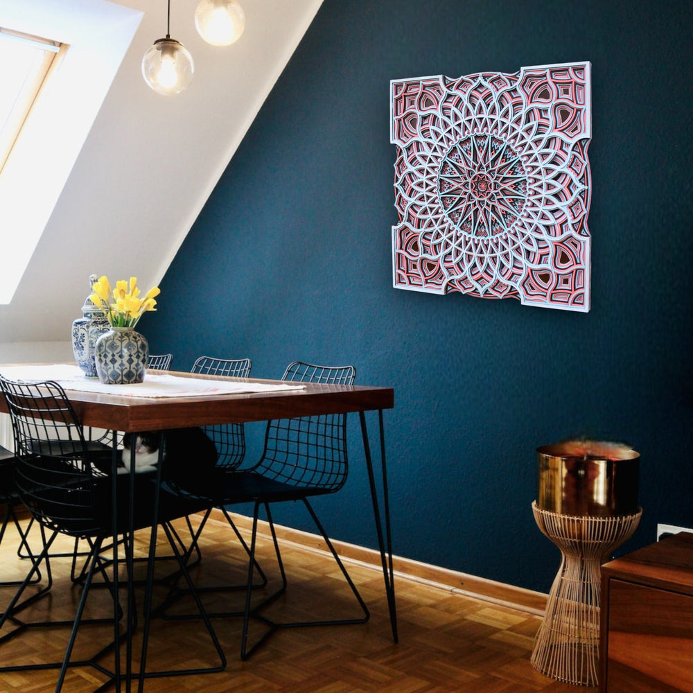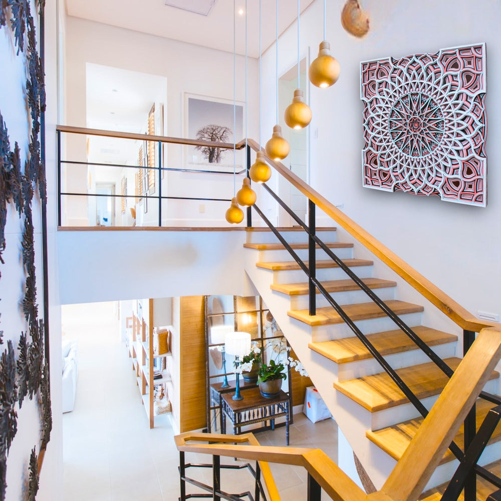 Step into a charming realm with 'New Arabian Style Square Mandala', a captivating artwork that captures the essence of mystical Arabian nights. Each in a very complicated or detailed manner carved pattern and contrast of bold reds against calming whites is a nod to the stars that guide us through life's journey, as revered in astrology.