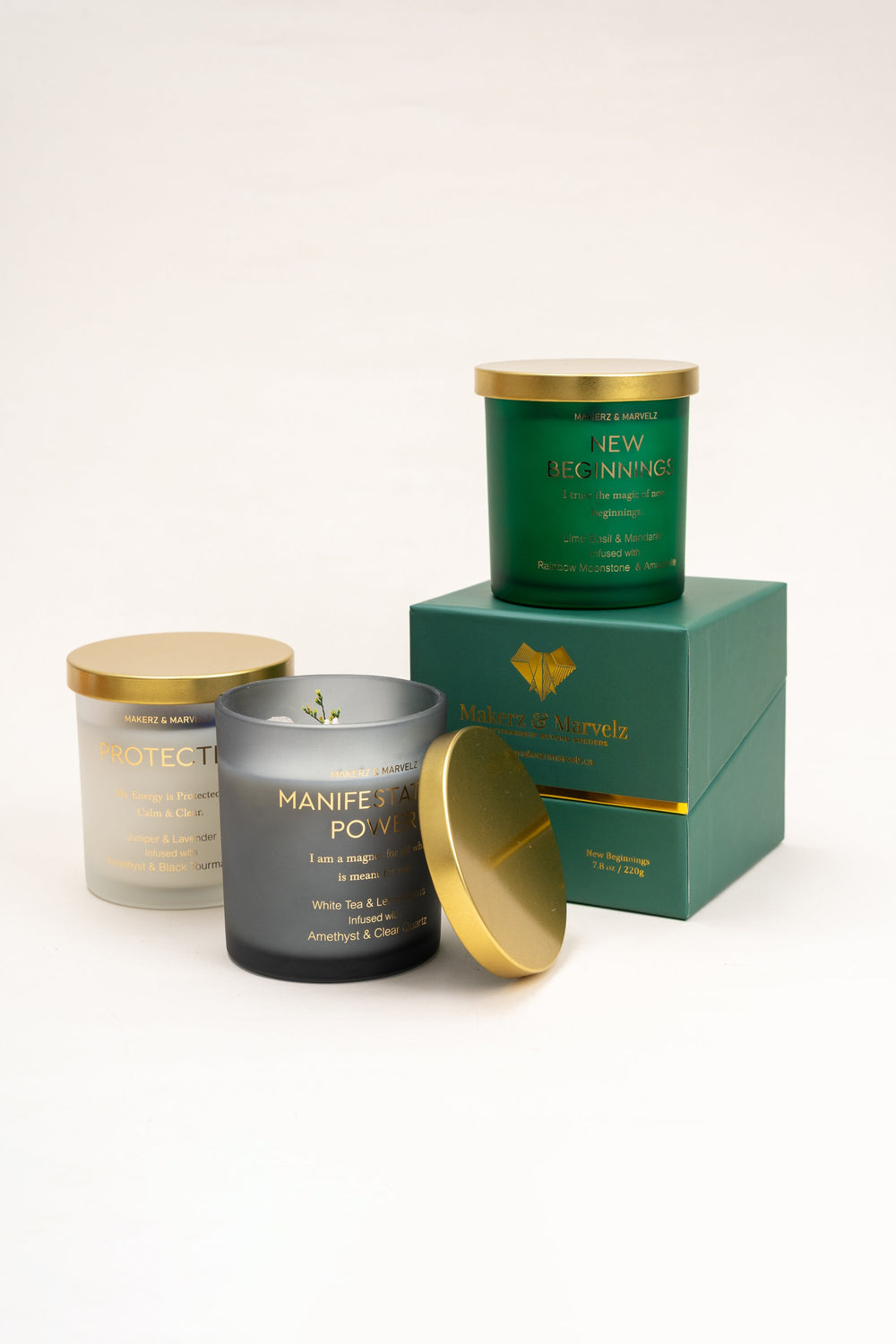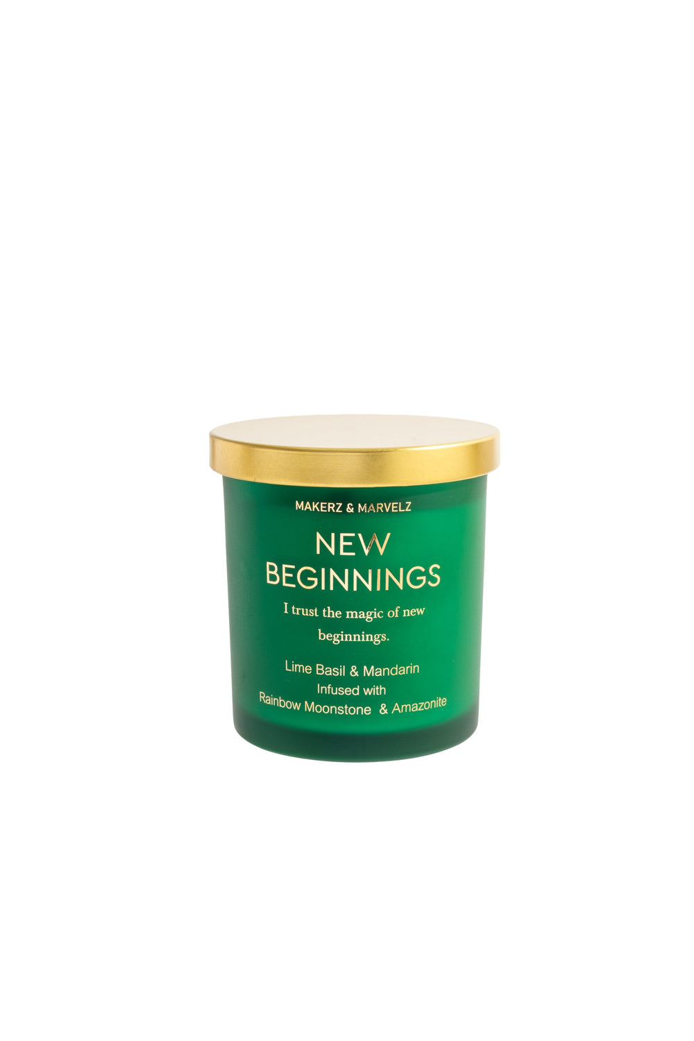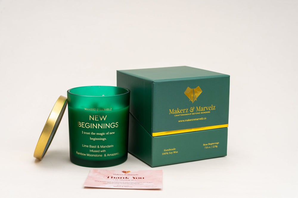 A refreshing candle that brings fresh, uplifting energy for new starts and positive change. Light when starting something new or clearing old energy. Made with 100% soy wax and poured into a matte green jar with a gold lid.
