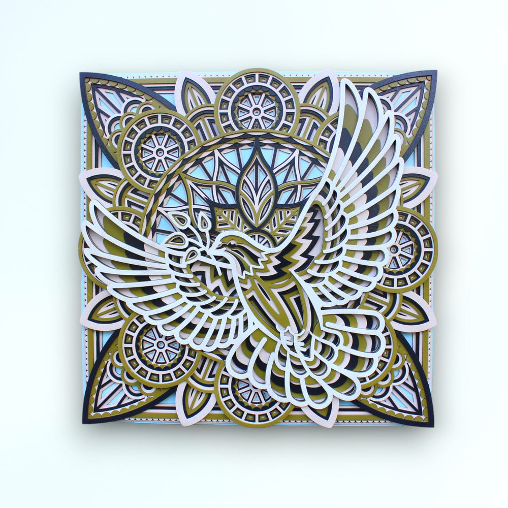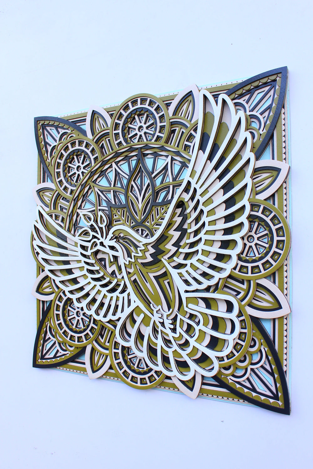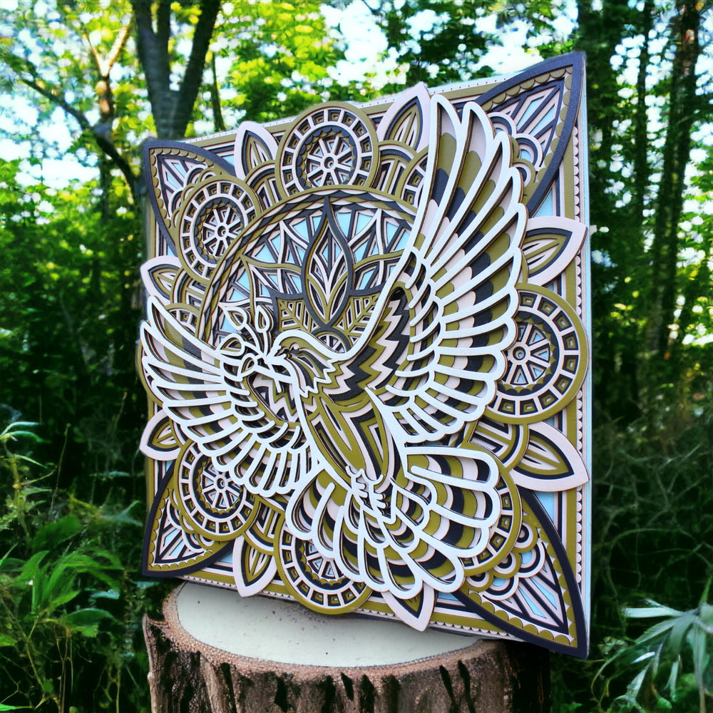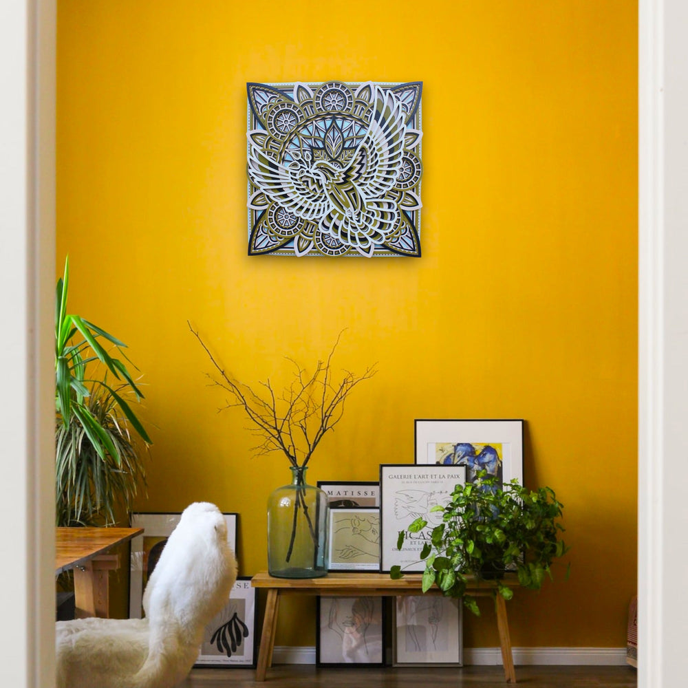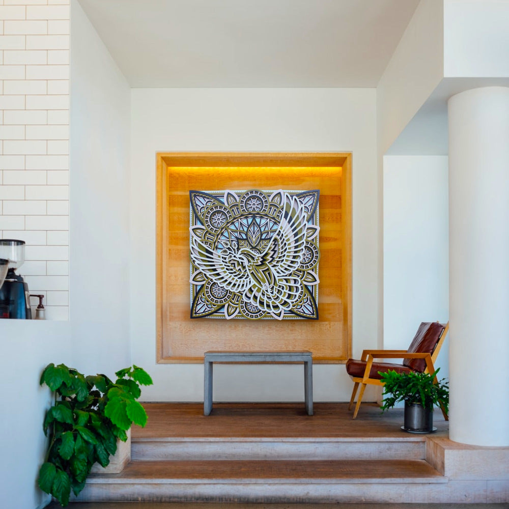 The New Dove Colored Square is an embodiment of calmness and skilled artisanship. Each piece is meticulously handcrafted, weaving together layers of richly stained wood to create a charming mandala pattern that invites a sense of calm and balance into any space.