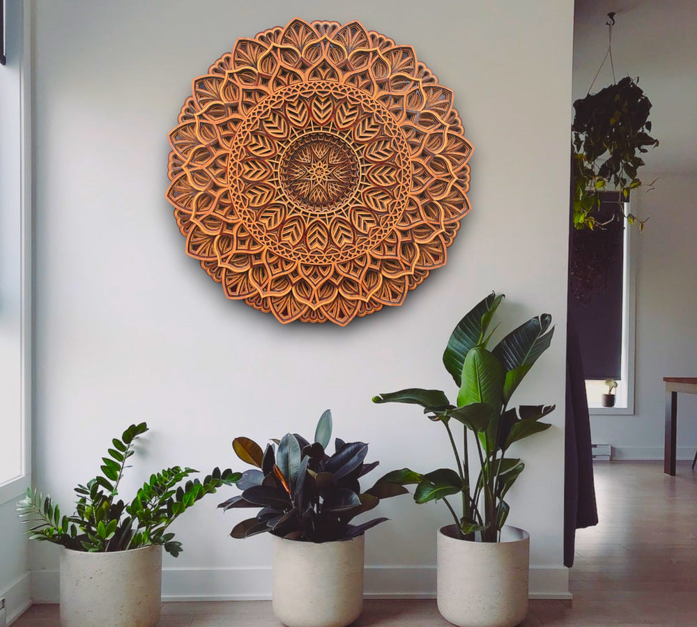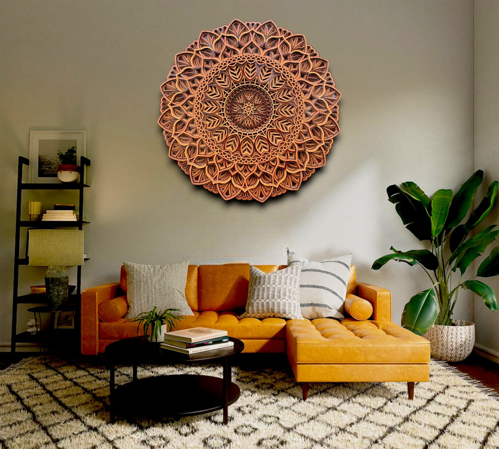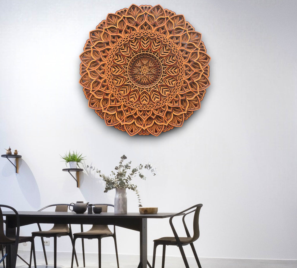Bring serenity and warmth to your home with our Traditional 3‑Tone Circle Mandala wall hanging. Crafted from sustainable wood, this hand‑carved piece features three interlocking layers with earthy red, orange and brown tones and a sunburst centre. The layered design adds depth and dimension, creating a focal point for your living room, meditation space or yoga studio.