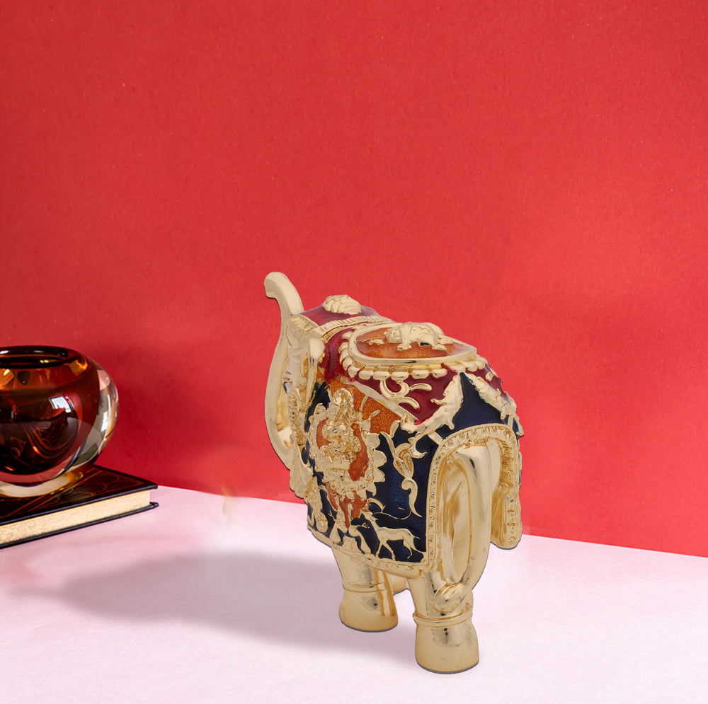 This intricately designed elephant idol, finished with 24 Carat Gold and Silver Electroplating, combines cultural richness with modern elegance. Its detailed craftsmanship and regal presence make it a versatile piece for home decor, office spaces, or gifting during festivals and special occasions.